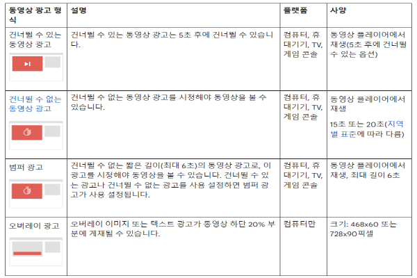 5초 후에 시청자들은 광고를 건너뛸 수 있으며 광고 형식은 건너뛸 수 있는 인스트림 광고는 유튜브 시청 페이지와 구글 비디오 파트너스가 운영하는 웹사이트 및 앱에 게시되며 요금은 CPV 입찰을 통해 시청자는 비디오를 시청하는 30초(30초 미만인 경우 비디오의 전체 재생 시간) 또는 비디오와 상호 작용할 때 비용을 지불하면 됩니다.