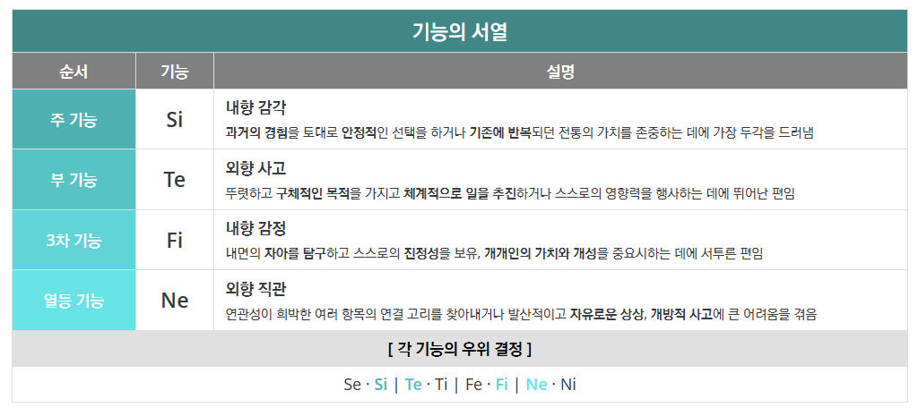 실제 사실에 대하여 정확하고 체계적으로 기억하며 일 처리에 있어서도 신중하고 책임감이 있으며 집중력이 강한 현실 감각을 지녔으며 조직적이고 침착합니다. 보수적인 경향이 있으며, 문제를 해결하는데 과거의 경험을 잘 적용하며, 반복되는 일상적인 일에 대한 인내력이 강하며 3차 기능인 Fi(내향 감정)로 인해 자신과 타인의 감정과 기분을 이해하는 능력이 부족하며, 4차 기능이 Ne(외향 직관)로 나무보다 숲을 보는 직관 능력이 매우 부족하여 전체적이고 타협적 방안을 고려하는 노력이 필요하며 정확성과 조직력을 발휘하는 분야의 일을 선호한답니다.