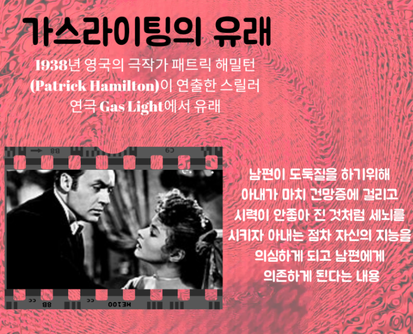 가스라이팅의 유래는 1954년 미국에서 개봉된 가스등(가스라이트)라는 영화에서 유래가 되었습니다. 이 영화의 내용은 아내가 가진 유명한 보석을 갖기 위해서 남편이 부인을 점차 정신병자로 만들어가는 과정을 보여줍니다.