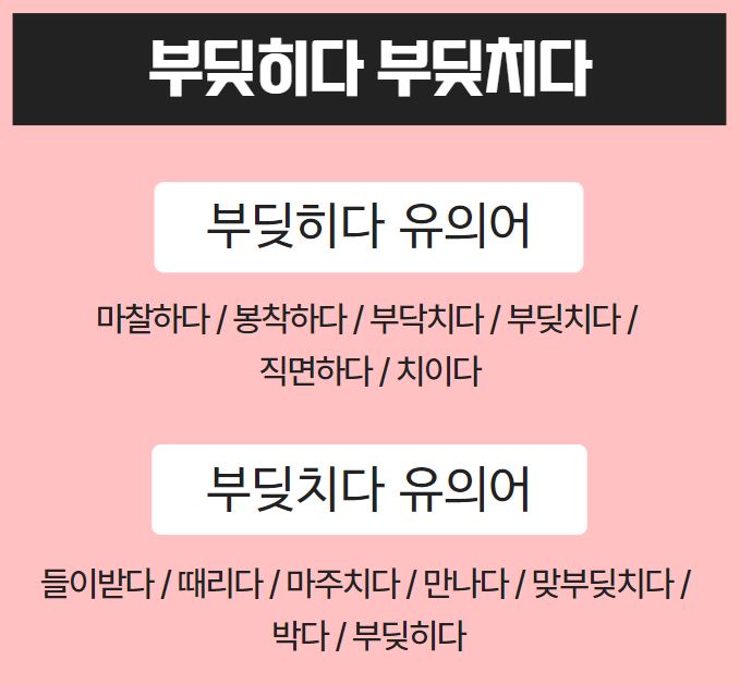 오늘은 부딪히다, 부딪치다의 내용에 대해 알아보았습니다. 두 말 모두 어느 때나 쓸 순 있지만, 의미가 약간씩 달라지기 때문에 적재적소에 구분하여 사용하시기 바랍니다.